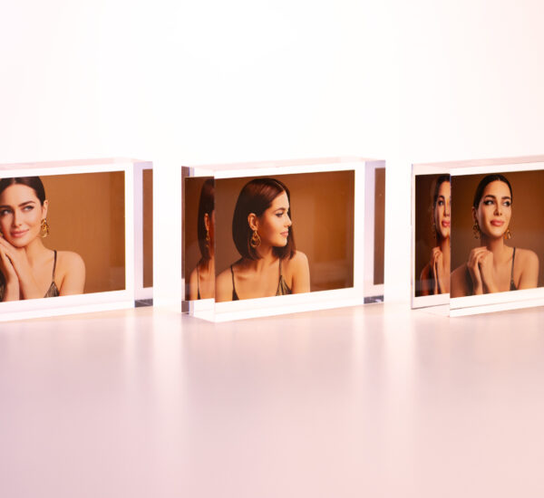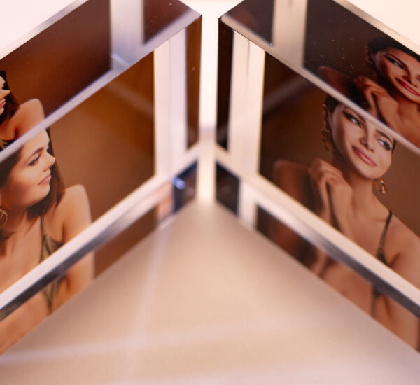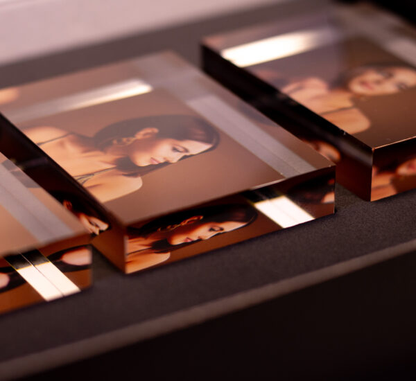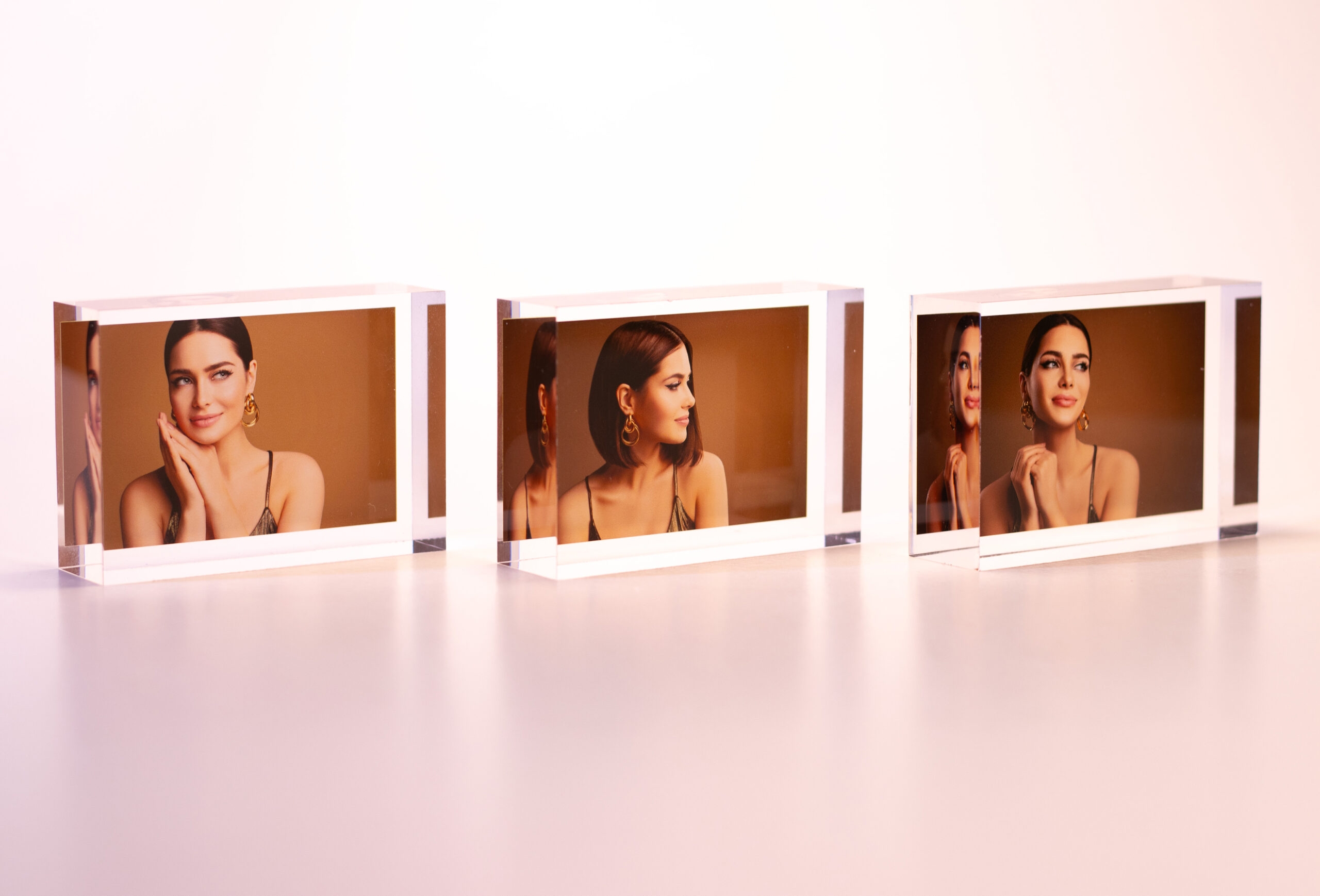 Suas fotos são impressas em alta definição, diretamente em blocos de acrílico virgem, com 2,5 centímetros de espessura, e a profundidade e a forma como a luz irradia através do acrílico cristal, proporcionam uma nova dimensão a como a fotografia ou a arte são visualizadas.